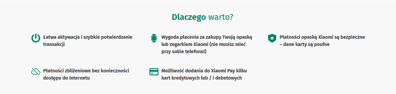 Usługa Xiaomi Pay chroni dane użytkownika. Dzięki temu numer posiadanej karty fizycznej nie jest przechowywany w opasce/ zegarku ani na serwerach dostawcy usługi. Nie jest również przekazywany sprzedawcy podczas dokonywania płatności.